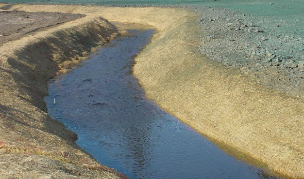 Straw wattles are dense by nature, thus they pool water. Wattles may be placed across channel bottoms, but their primary use is on hill slopes to break up slope lengths and slow overland flow.